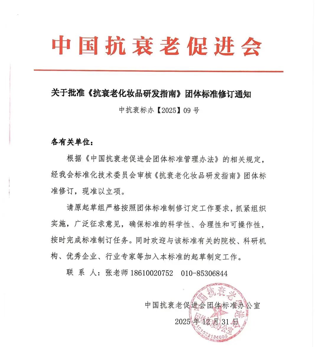 为响应国家药品监督管理局《关于深化化妆品监管改革促进产业高质量发展的意见》中“健全标准体系、填补重点领域标准空白”的号召,推动抗衰老化妆品领域向科学化、规范化、高质量发展转型,现决定对2023年发布实施的团体标准《抗衰老化妆品研发指南》(T/ZGKSL 001-2023)组织开展修订工作。本次修订旨在积极对接行业最新监管要求与科研进展,对原标准进行系统性完善与升级,以确保其持续发挥行业引领作用。此标准修订项目已通过中国抗衰老促进会审核,并于2025年12月31日正式批准立项。项目的修订工作已于近期启动,并计划于2026年3月底在北京举行的“第五届中国抗衰老化妆品产业发展大会暨2026中国抗衰老促进会化妆品产业分会年会”上举行正式启动仪式。
